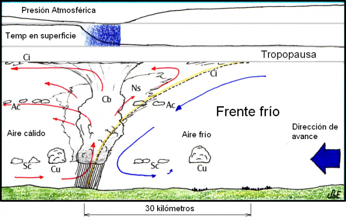 temperaturas y por ende diferentes densidades, donde la más fría por ser más pesada actuará en forma de cuña introduciéndose por debajo de la más cálida haciéndola ascender y formándose de ésta manera nubosidad productora de precipitaciones y condiciones adversas. En la zona de confrontación de éstas masas de aire se crea una línea de inestabilidad, la cual es la que los meteorólogos marcamos en los mapas de superficie en colores azules con triángulos (si es un frente frío), en rojo con semicírculos (si es cálido) y con algunas otras variables (si el frente es ocluido o estacionario). Las masas de aire de diferentes temperaturas, a diferencia de otros fluidos, no se mezclan, es decir que una masa fría con una cálida no se van a unir para formar una «tibia». Mantienen su identidad y por ende su confrontación.