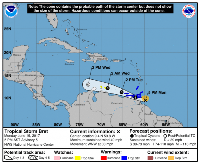 La Onda Tropical No.21 de la temporada 2017 proveniente de costas africanas, fue evolucionando progresivamente en su avance por El Atlántico alcanzando el día de ayer el nivel de monitoreo de «Potencial Ciclón Tropical» por parte del Centro Nacional de Huracanes (NHC). Hoy ya ha reunido las condiciones necesarias para ser catalogada oficialmente como la Tormenta Tropical BRET 2017 por corresponderle el segundo nombre de la lista que se estará utilizando durante éste año. Recordemos que ya se formó ARLENE fuera de temporada entre el 19-21 de abril pasado.