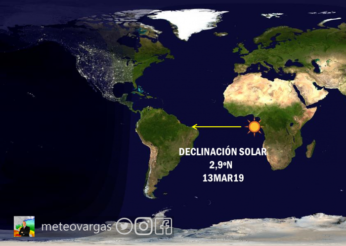 Para el día de hoy 13 de marzo de 2019, la declinación solar se encuentra incidiendo perpendicularmente en los -2.8º Sur. Ya entre los días 20 y 21 de éste mes, ésta declinación aparente del Sol comenzará a llegar sobre Venezuela, desde su extremo más Sur o punto más austral, conocido como la Naciente del Río Ararí, Estado Amazonas, hasta que «barra» progresivamente el resto del país en sentido Sur-Norte (si se desea conocer la declinación real es preciso tener en cuenta las correcciones debida al paralaje, la aberración anual, la precesión y la nutación. Además, si el astro pertenece al sistema solar habrá que tener en consideración la aberración planetaria y el paralaje geocéntrico). De allí es que de acuerdo a las estadísticas climatológicas, comenzarán los días con más calor para Venezuela y, es precisamente en este trimestre (marzo-abril-mayo) donde se han registrado históricamente, las temperaturas máximas absolutas para gran parte del territorio nacional.