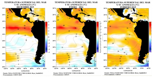 En febrero 2016 las anomalías de la Temperatura Superficial del Mar (TSM) disminuyeron en gran parte del Pacífico Tropical central-oriental;...