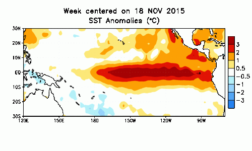 Para mediados de diciembre de 2015, la Temperatura Superficial del Mar en el Pacífico tropical se encontraba en un nivel fuerte...