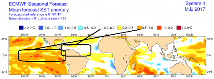 De acuerdo a los análisis de los datos que ha emitido el Centro Nacional de Predicciones Ambientales (NCEP) de la Agencia Nacional Océano Atmósfera (NOAA) de los EE.UU. y la última actualización del modelo europeo a mediano plazo ECMWF, en buena parte de Venezuela las lluvias se mantendrán cercanas a lo habitual y por debajo de los promedios en varias regiones. Esto tomando en cuenta las posibles anomalías positivas que seguirán registrándose en el Océano Pacífico ecuatorial (temperaturas superficiales del mar por encima de lo normal) y su interacción con la atmósfera, donde inclusive pudiera llegar a consolidarse lo que se conoce como El Fenómeno El Niño a partir de julio-agosto. Y de nuestro lado, o sea, hacia El Mar Caribe, las anomalías positivas que se venían presentando en meses anteriores volverían a sus patrones normales, al menos durante éste trimestre de mayo-junio-julio.