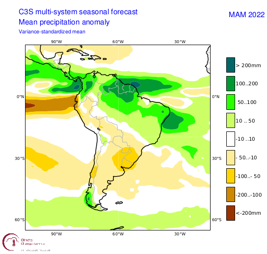 Modelo C3S: Lluvias sobre lo normal en gran parte del país durante este trimestre