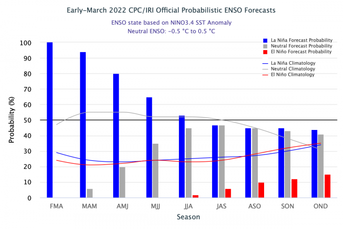 De esta manera y como observamos en la gráfica de barras anterior, se espera que La Niña continúe hasta el verano del hemisferio norte (53% de probabilidad durante junio-agosto de 2022) y con un 40-50% de probabilidad de persistir La Niña o ENSO-neutral. A partir del trimestre julio, agosto y septiembre la incertidumbre es muy amplia como para emitir una predicción efectiva.