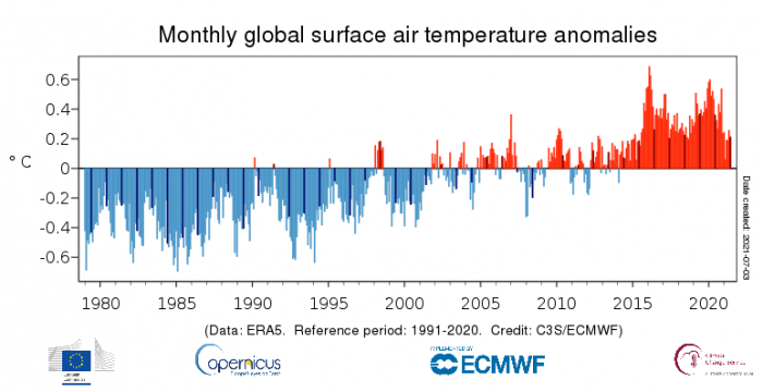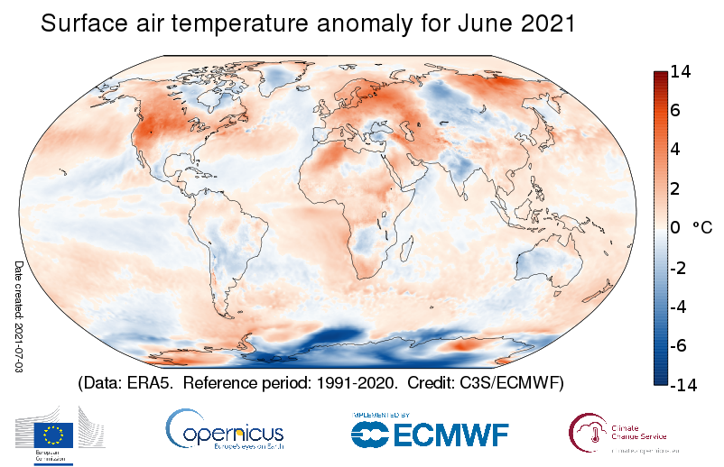 En su informe mensual sobre la temperatura del aire a nivel de superficie, el Servicio para el Cambio Climático de Copernicus, reseñó que «junio ​​de 2021 se une a junio de 2018 como el cuarto junio más cálido registrado a nivel mundial, después de junio de 2016, 2019 y 2020«. Entre los aspectos más importantes para el mes pasado, se considera que junio ​​de 2021 fue considerablemente más cálido que el promedio en gran parte de Europa. Las temperaturas fueron particularmente altas en Finlandia y el oeste de Rusia: el promedio de junio fue el más alto en un sitio en Helsinki con mediciones que datan desde 1844, y Moscú experimentó su día de junio más cálido registrado. Las condiciones de la ola de calor también se experimentaron en muchos otros países europeos. Por el contrario, las temperaturas del mes en su conjunto estuvieron cerca o por debajo de la media en el sureste del continente, la Península Ibérica, el oeste de Irlanda, Islandia y Svalbard.