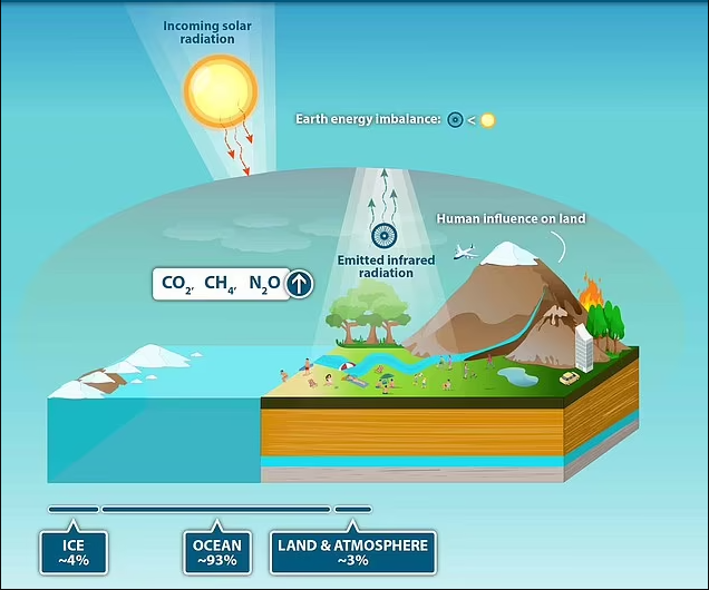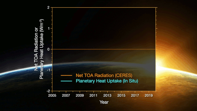 El desequilibrio energético de la Tierra se ha duplicado en un período de 14 años que comprende de 2005 a 2019, según un estudio dirigido por investigadores de la NASA. Esto significa que se está absorbiendo más energía del Sol de la que se refleja hacia el espacio, desequilibrando la energía de la Tierra y calentando el planeta. El desequilibrio energético positivo de la Tierra se debe al aumento de la contaminación atmosférica en forma de gases de efecto invernadero como el dióxido de carbono (CO2), el metano (CH4) y el ozono (O3), dicen los investigadores.
