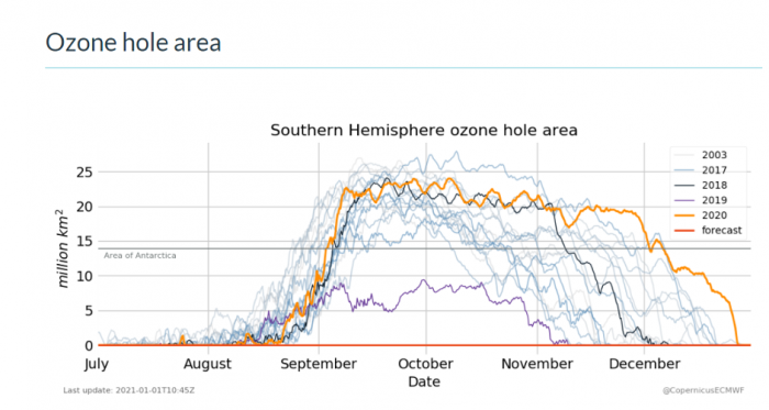 Cuando las temperaturas en la alta atmósfera (estratosfera) comienzan a subir a fines de la primavera del hemisferio sur, el agotamiento del ozono se ralentiza, el vórtice polar se debilita y finalmente se descompone, y para fines de diciembre los niveles de ozono vuelven a la normalidad. Sin embargo, en 2020, un vórtice polar fuerte, estable y frío mantuvo la temperatura de la capa de ozono sobre la Antártida constantemente fría, evitando la mezcla de aire agotado sobre esa zona con aire rico en ozono de latitudes más altas. Durante gran parte de la temporada 2020, las concentraciones de ozono estratosférico alrededor de 20 a 25 km de altitud (50-100 hPa) alcanzaron valores cercanos a cero con la profundidad de la capa de ozono tan baja como 94 unidades Dobson (la unidad de medida), o aproximadamente un tercio de su valor normal. El Servicio de Monitoreo Atmosférico de Copérnico de la UE informó que los análisis de ozono mostraron que el agujero de ozono se había cerrado el 28 de diciembre. Cada temporada, la aparición del agujero de ozono y su evolución es monitoreada por medio de satélites y una serie de estaciones de observación terrestres. Las características del agujero de ozono, mapas interactivos, series de tiempo, estado actual y pronóstico están siendo preparados y monitoreados por la gran comunidad del ozono a través de los servicios de diferentes organizaciones como el Servicio de Monitoreo de la Atmósfera de Copernicus (CAMS), el programa Ozonewatch de la NASA, NOAA, KNMI, ECCC y otros.