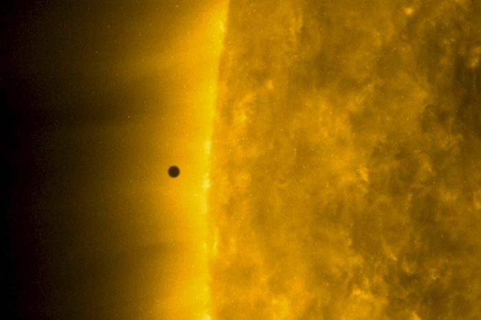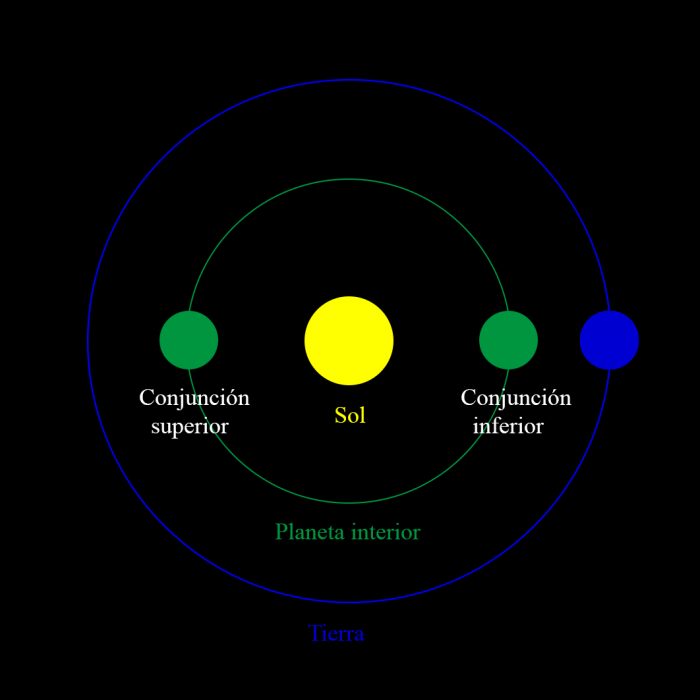En la superior el planeta está detrás del Sol (visto desde la Tierra); en la inferior el planeta está delante del Sol. Un ejemplo, la conjunción solar inferior de Mercurio significa que la Tierra, Mercurio y el Sol están alineados. Mercurio está delante del Sol en el caso de hoy. Dado que se encuentra entonces a la mínima distancia de la Tierra, el planeta alcanza en ese momento su mayor diámetro angular en el firmamento terrestre. A pesar de ello, no puede ser observado ya que se encuentra muy cerca del Sol y presenta su hemisferio nocturno hacia la Tierra; así que debemos esperar para que comience a aparecer antes del amanecer durante los próximos días. Si se dan ciertas condiciones adicionales, durante una conjunción inferior puede producirse un tránsito del planeta a través del disco solar, y ser observado por la sonda SOHO (Solar and Heliospheric Observatory):