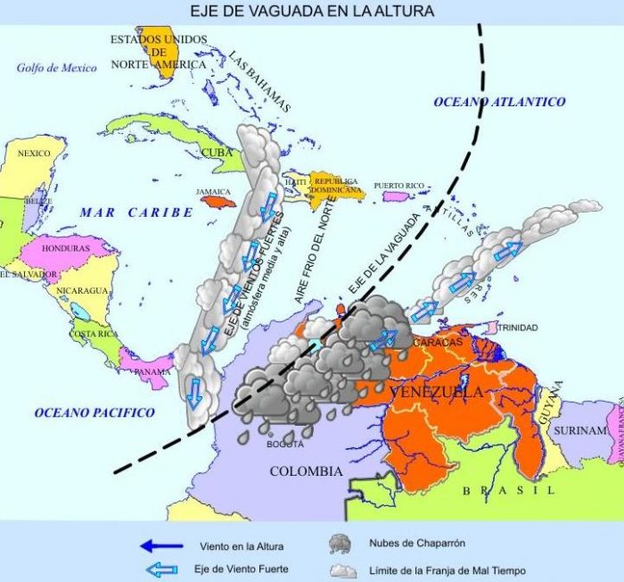 De esta manera se produjo una matriz de opinión errada sobre las vaguadas, siendo un fenómeno meteorológico muy común en nuestra zona. Algunas vaguadas producen lluvias relevantes en nuestro país, otras no consiguen un entorno favorable y producen apenas algunas lloviznas o nubosidad parcial sin precipitaciones. Otras pasan desapercibidas por el común de la población. Por lo cual debemos tener en cuenta de ahora en adelante que las vaguadas siempre han existido, existen y existirán en nuestra meteorología tropical. Es un fenómeno completamente normal que viene produciéndose todos los años en las costas septentrionales de la América del Sur. Una vaguada se debe relacionar principal y directamente con los campos de presión atmosférica, temperatura o vientos, respectivamente, pero NUNCA con la precipitación o tiempo presente en superficie. Y allí es donde comienza la confusión de muchos al asociar a las vaguadas con cualquier lluvia que ocurra. Hay diversos tipos de vaguadas entre las que encontramos: vaguadas barométricas, dinámicas, en los vientos del este y del oeste, frías, polares, y algunos autores sugieren otras variedades de acuerdo a la zona donde se establezca. Tal y como se explica en “Meteored” la revista del tiempo.com, “el concepto y el uso de vaguada se están empleando actualmente de forma muy generalizada y ambigua en algunos medios de comunicación. Desde su sentido tradicional, se ha pasado a representar o equivaler a “líneas de cambio de tiempo”, líneas de tormentas, zonas de convergencia, zona de precipitación orográfica, etc., cuando realmente no es así en la gran mayoría de los casos”.