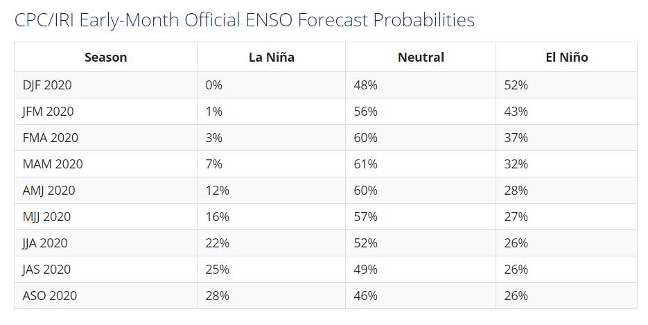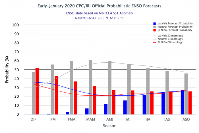 La mayoría de los modelos en el IRI/CPC continúan favoreciendo principalmente condiciones de ENSO-neutral (índice Niño-3.4 entre -0.5°C y +0.5°C) durante el verano del hemisferio norte. Para la temporada de enero a febrero 2020, se pronostica que el índice del Niño-3.4 estará cerca de +0.5°C, lo que es consistente con las ultimas observaciones realizadas. Los pronosticadores también favorecen que temperaturas oceánicas por encima del promedio continúen en el próximo mes o dos, pero, en acuerdo con la mayoría de las guías de los modelos, no prevén una continuación durante varias estaciones consecutivas o cambios en la circulación atmosférica que indiquen El Niño (al menos por un trimestre). En resumen, se favorecen condiciones neutrales del ENSO durante la primavera del 2020 del hemisferio norte (60% de probabilidad), continuando hasta el verano 2020 (~50% de probabilidad). Igualmente debemos recordar, que debe existir un acoplamiento entre las condiciones oceánicas y las atmosféricas para poder declarar la consolidación del fenómeno El Niño o La Niña, dependiendo el caso.
