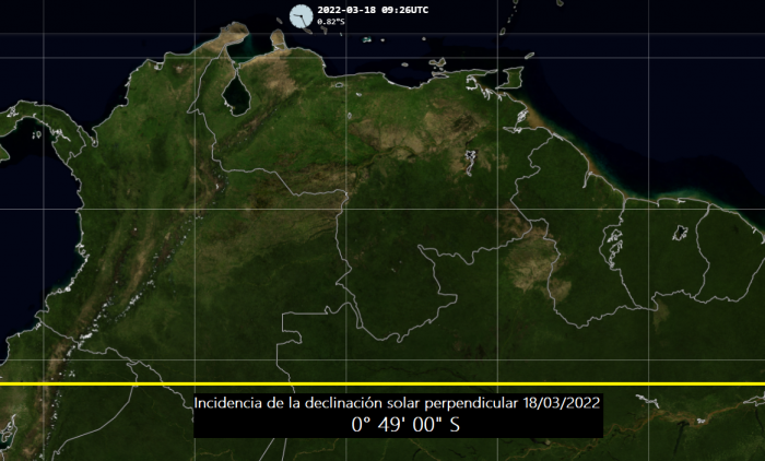 Ya hoy 18 de marzo de 2022, la declinación solar se encuentra incidiendo perpendicularmente en los -0° 49′ 00″ sur, lo que quiere decir que se acerca a nuestro territorio nacional. Esto comenzará a ocurrir exactamente entre los días 21 y 22 de éste mes, desde el extremo más sur o punto más austral, conocido como la Naciente del Río Ararí, estado Amazonas, hasta que «barra» progresivamente el resto del país en sentido sur-norte.