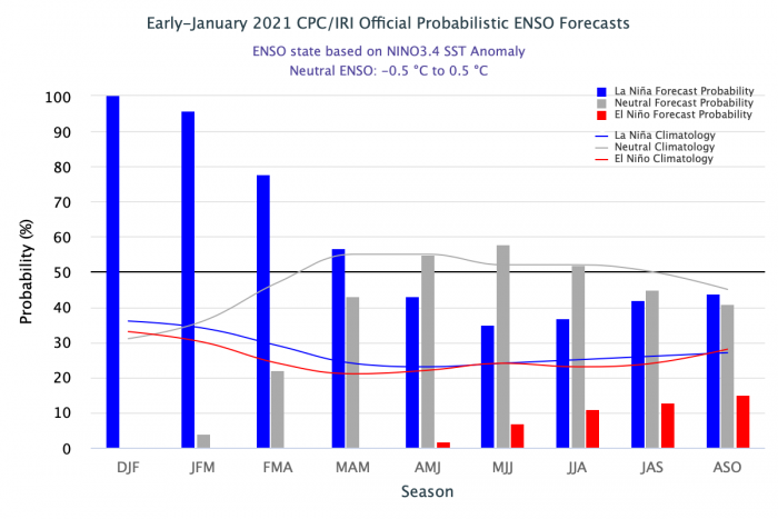 En el informe que ha emitido el día de hoy, el Centro de Predicciones Climáticas de la NOAA conjuntamente con el Instituto Internacional de Investigación de clima y sociedad, indican que se espera que el fenómeno La Niña continúe durante el invierno 2020-21 del hemisferio norte (~95% de probabilidad que permanezca durante enero-marzo 2021), con el potencial de una transición a ENOS-neutral durante la primavera de éste año (55% de probabilidad durante abril-junio). Recordemos que ENOS significa El Niño Oscilación del Sur, lo cual hace referencia a las variables climáticas tanto de El Niño como de La Niña.