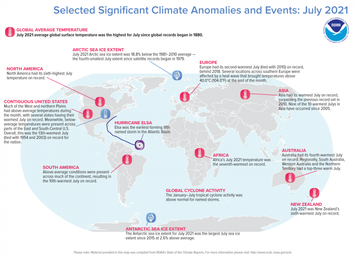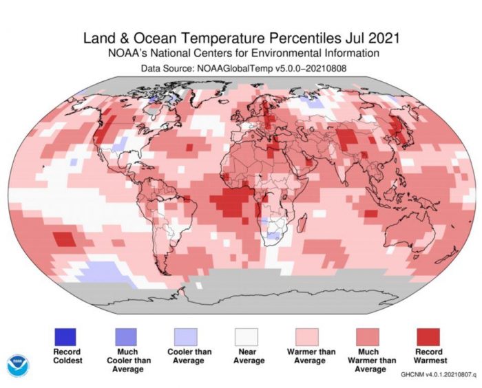 De acuerdo a los nuevos datos globales publicados hoy por los Centros Nacionales de Información Ambiental de la NOAA, julio 2021 fue el mes más caluroso registrado en la Tierra. El administrador de la NOAA, Rick Spinrad, nos recuerda que «julio es típicamente el mes más cálido del año en el mundo, pero julio de 2021 se superó a sí mismo como el julio y el mes más caluroso jamás registrado. Este nuevo récord se suma al perturbador camino que el cambio climático ha establecido para el mundo».