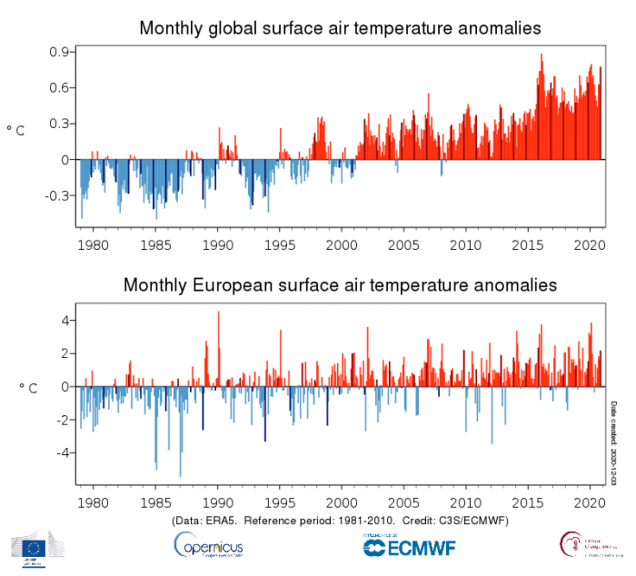 - Noviembre de 2020 también fue el cuarto mes más extremo de todos en términos de calor global en comparación con el promedio climatológico del mes en cuestión. Su anomalía de temperatura estuvo a la par con la de enero de 2020. Solo febrero y marzo de 2016 y febrero de 2020 fueron más extremos, con temperaturas respectivamente 0,88 °C, 0,82 °C y 0,80 °C por encima del promedio.