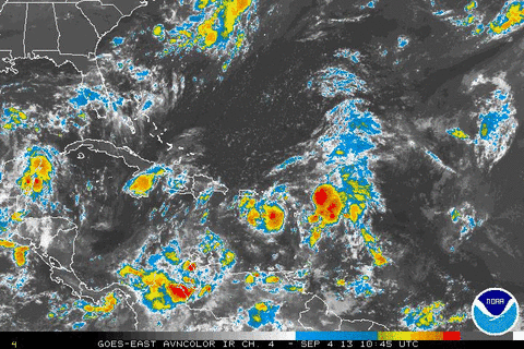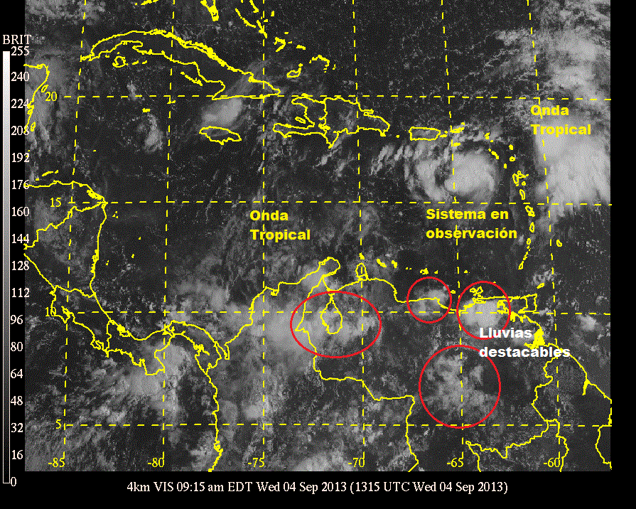En la siguiente animación se aprecian el sistema en observación, Onda Tropical próxima a las Antillas Menores y la modulación de la nubosidad en la zona.
