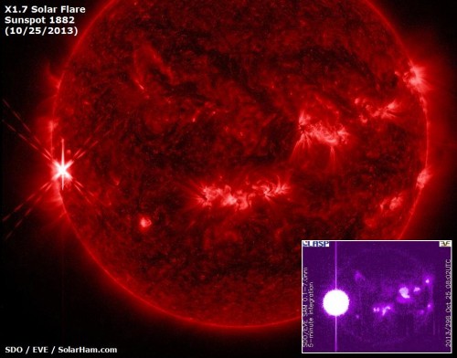 Una gran llamarada solar de clase X alcanzando el X1.7 (se traduce en una llamarada "fuerte" según la escala) se...